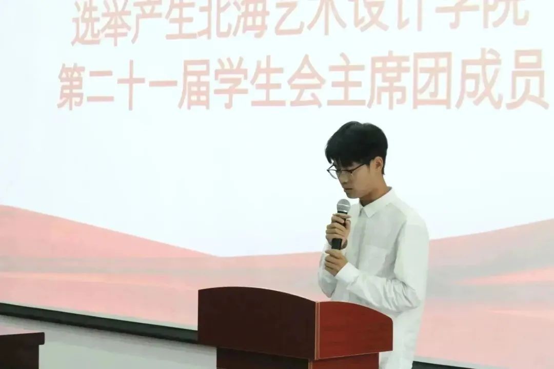 经过民主选举,产生了北海艺术设计学院第十六次学生会主席团成员,并宣读了倡议书。
