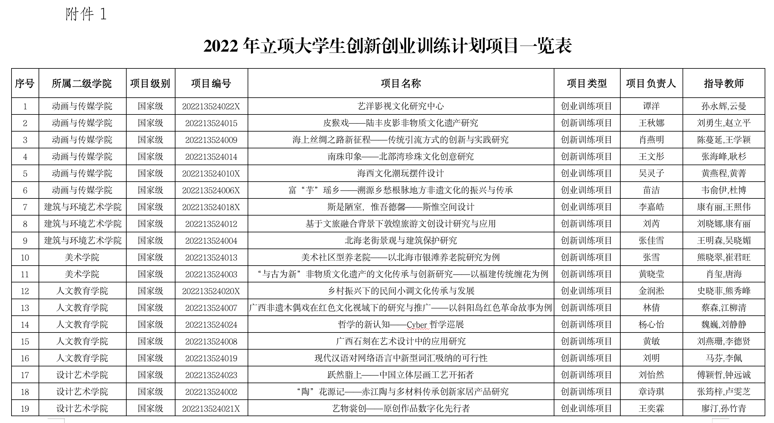 附件:1.2022年立项大学生创新创业训练计划项目一览表