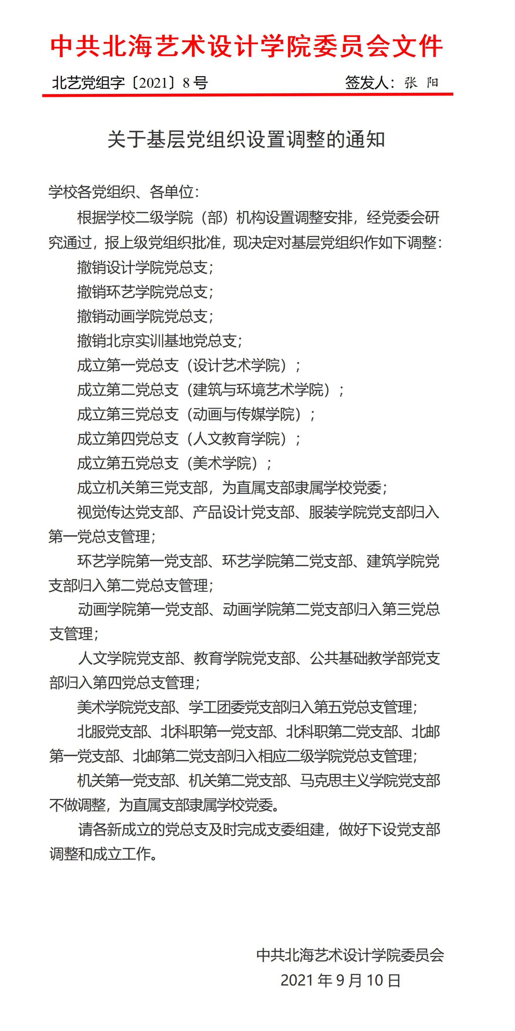转发学校党委《关于基层党组织设置调整的通知》