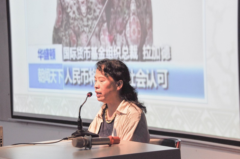 讲座开始,徐教授亮出国际货币基金组织总裁拉加德身穿旗袍的图片,她指出不仅人民币被国际社会认可,中国的传统服饰也将被世界所认可,以小见大引出中国服饰之美,引起了现场同学们浓烈的听讲兴趣。