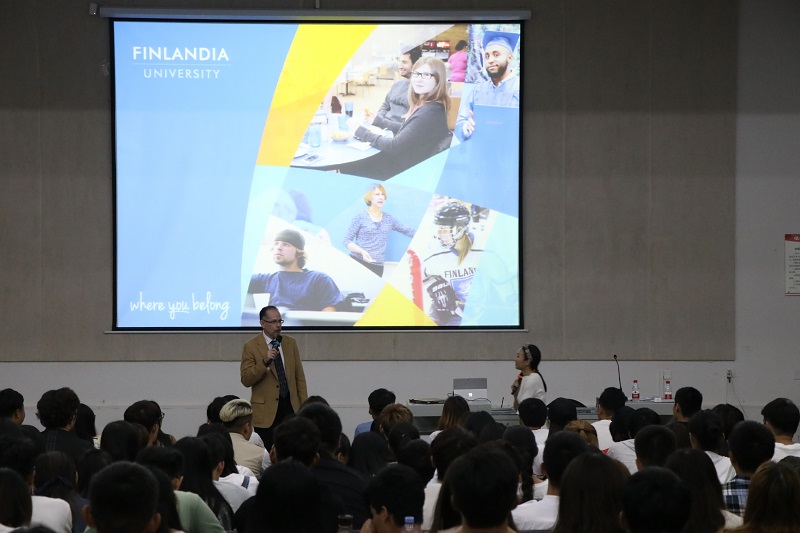 交流中,Richard Lynn Gee教授通过照片给同学们详细介绍了芬兰迪亚大学建校的初期历史、校园地理位置和天气状况等,并通过视频向师生们展示了芬兰迪亚大学的校园环境和校园生活,使同学们更直观地了解芬兰迪亚大学。