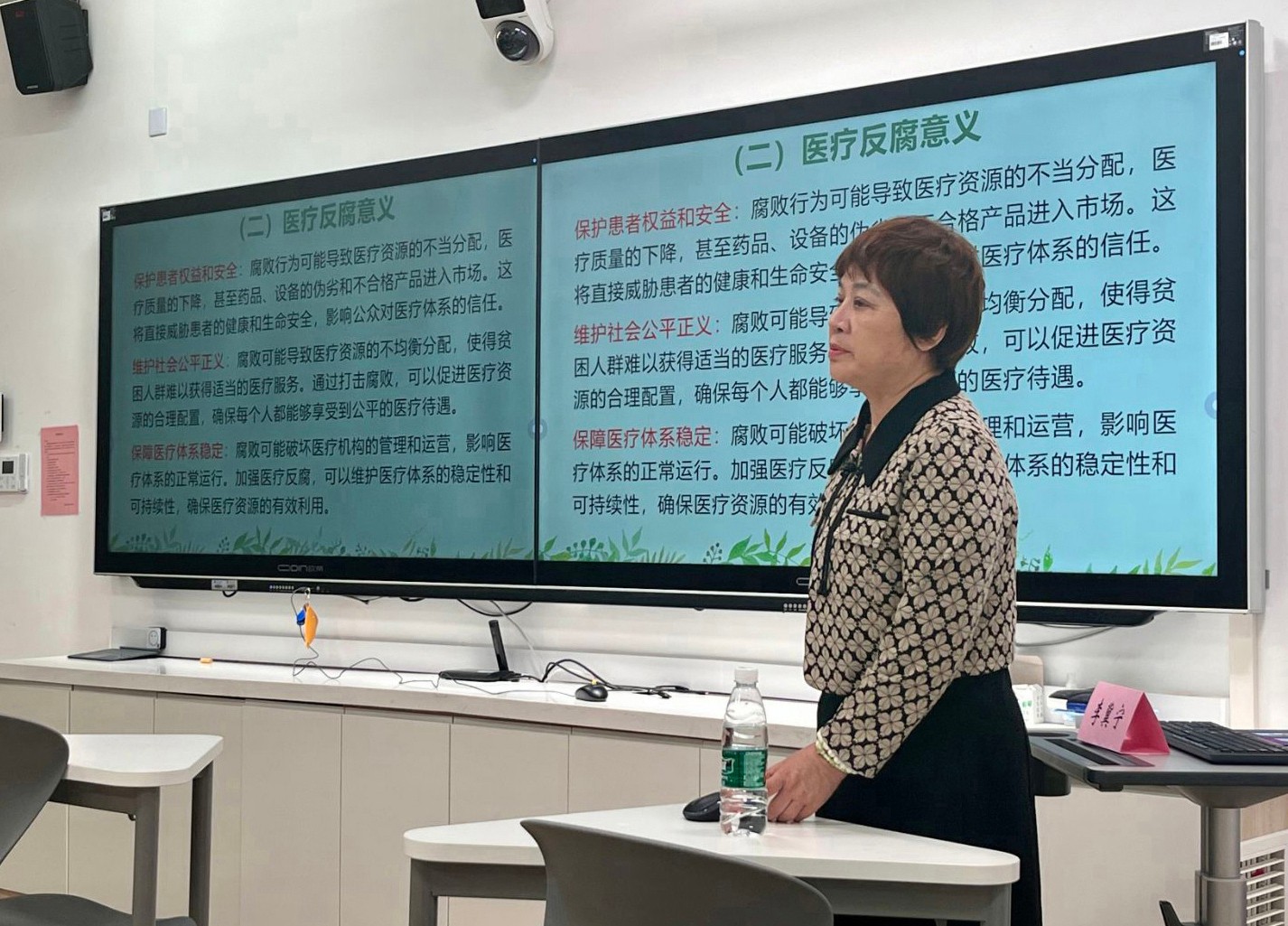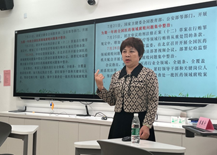 李教授主要从医疗反腐的背景和意义、我国医疗反腐历程及域外医疗反腐简介、医疗反腐防腐与反思三大部分进行讲授。首先,她结合实际案例认真剖析了医疗腐败的常见情形、积极意义,全面阐述了我国医疗反腐目前的形势、相关法律法规以及所取得的成效。其次,她对我国医疗反腐历程及域外医疗反腐史进行了比较系统的梳理。她以美国和日本为例展开叙述,指出医疗腐败是一个全球性问题,任何国家都不敢宣称完全没有医疗腐败问题。最后,她认为,医疗反腐既要“疾风之力”更要久久为功。一是完善相关法律法规、建立医药代表约束机制、优化医药分家等制度;二是加强行业自律、规范行业行为,强化各级医药医务人员慎独慎众的理念教育。