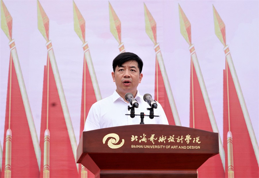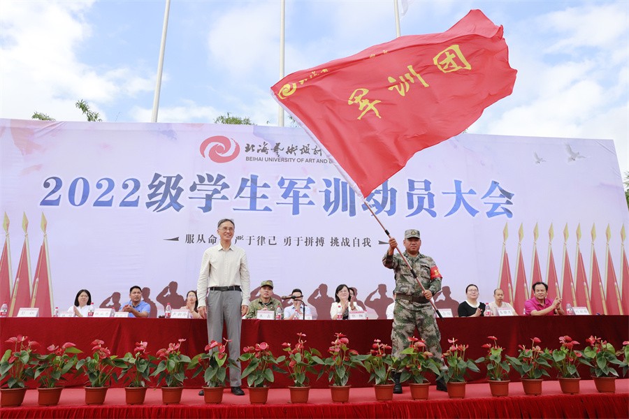 北海市海城区人民武装部政委王鑫在讲话中阐述了军训的重要性,通过军训进一步增强学生的国防知识和军事技能,引导学生在军事化管理中培养良好的生活学习习惯,在感悟军人使命、体验部队式生活中加强使命担当,激发保家卫国的责任感,也在军训后变得更加勤奋坚强。他希望同学们能端正参训态度,保持高昂热情,展现迷彩在身的无上荣光;保持坚韧毅力,刻苦认真训练,培养永不言弃的精神高地,服从教官管理,严格自身要求,养成令行禁止的优良作风;团结奋斗、加强互帮互助,打造坚强有力的和谐集体;以此次军训为契机,以中华民族伟大复兴为己任,做一个自信阳光、善良正直、勇敢睿智的人,积极传播正能量,为社会贡献力量。他还对全体军训教官提出要求:要准确把握、严密组织、稳妥推进,在严格要求中科学施训,在要求效果中注重过程,在训练内容中保障安全。