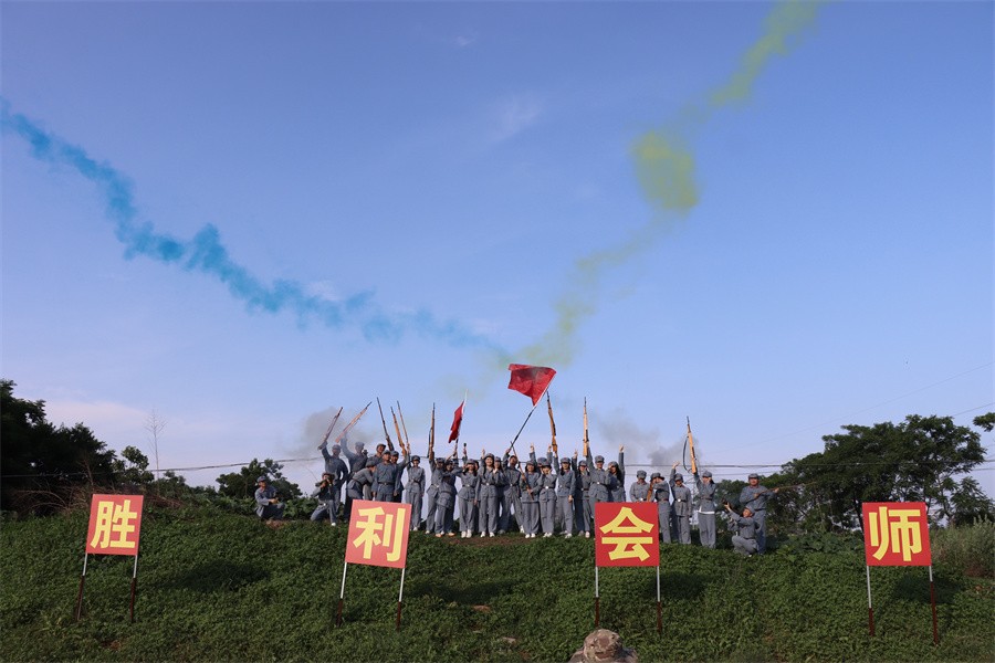 在“湘江战役”实景教学环节,学生穿上红军服,进行了强渡湘江、碉堡防敌、野外拓展、团队拓展训练等系列活动演练,通过实景教学引导受助学生真正把爱国情怀内化于心、外化于行,激励受助学生成为具有爱国、励志、感恩、诚信优良品质的践行者。