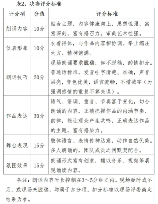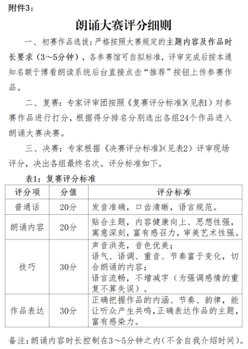 (二)朗诵要求。使用普通话朗诵,时长严格控制在3—5分钟内。