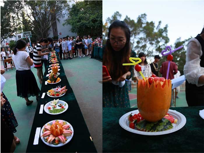 在正值天气炎热的下午,比赛如火如荼的展开。同学们热情高涨活力无限,活动有40组队伍分两轮进行,每轮时间均为30分钟,每轮比赛结束后评委随即现场评分。本次活动同学们充分发挥了自己的想象力和创造力,各种创意和妙想层出不穷,各小组认真实践自己的创意,高质量地完成水果的切拼、造型及水果拼盘主题设计制作,其中有不少作品令人惊喜赞叹。