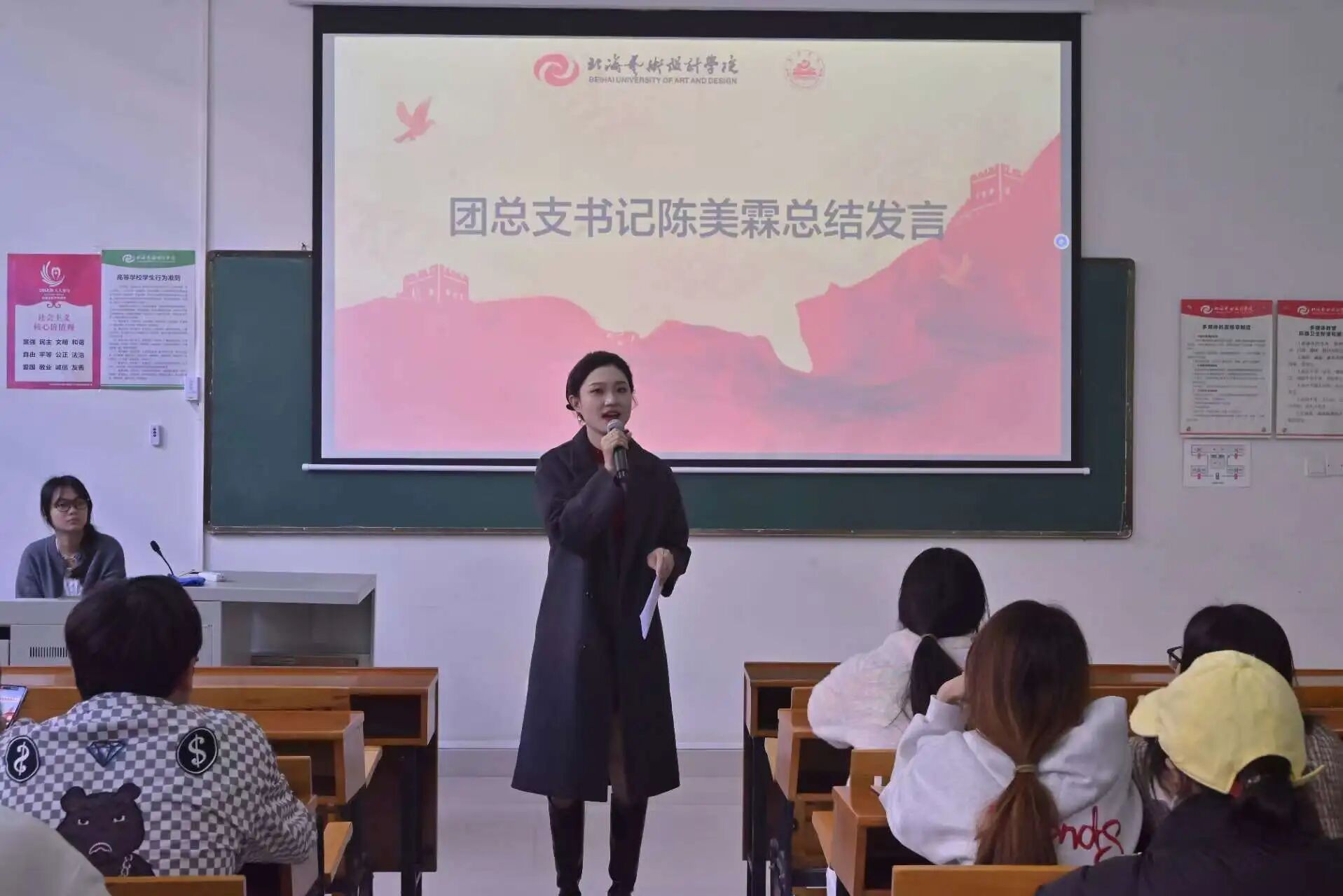 为全面总结本学期团总支各部门工作情况,表彰表现突出的优秀个人,激励全体学生干部在新学期再创佳绩,2026年1月14日,教育学院团总支工作总结暨表彰大会在公德楼102教室顺利举行。团总支书记陈美霖与全体学生干部参加大会。