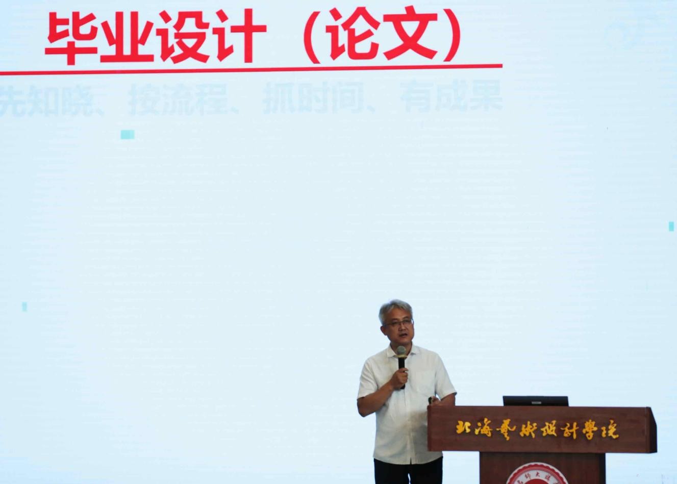 首先,北海艺术设计学院副校长邱杰通过对专业前景的分析,向同学们讲解北京学习的重要性。作为政治经济文化中心的背景,其浓厚的艺术氛围和庞大的就业市场,是任何一个地区都不能替代的。他希望同学们能利用这一年的在京学习,发现机遇紧紧把握,使自己快速成长,学有所成。