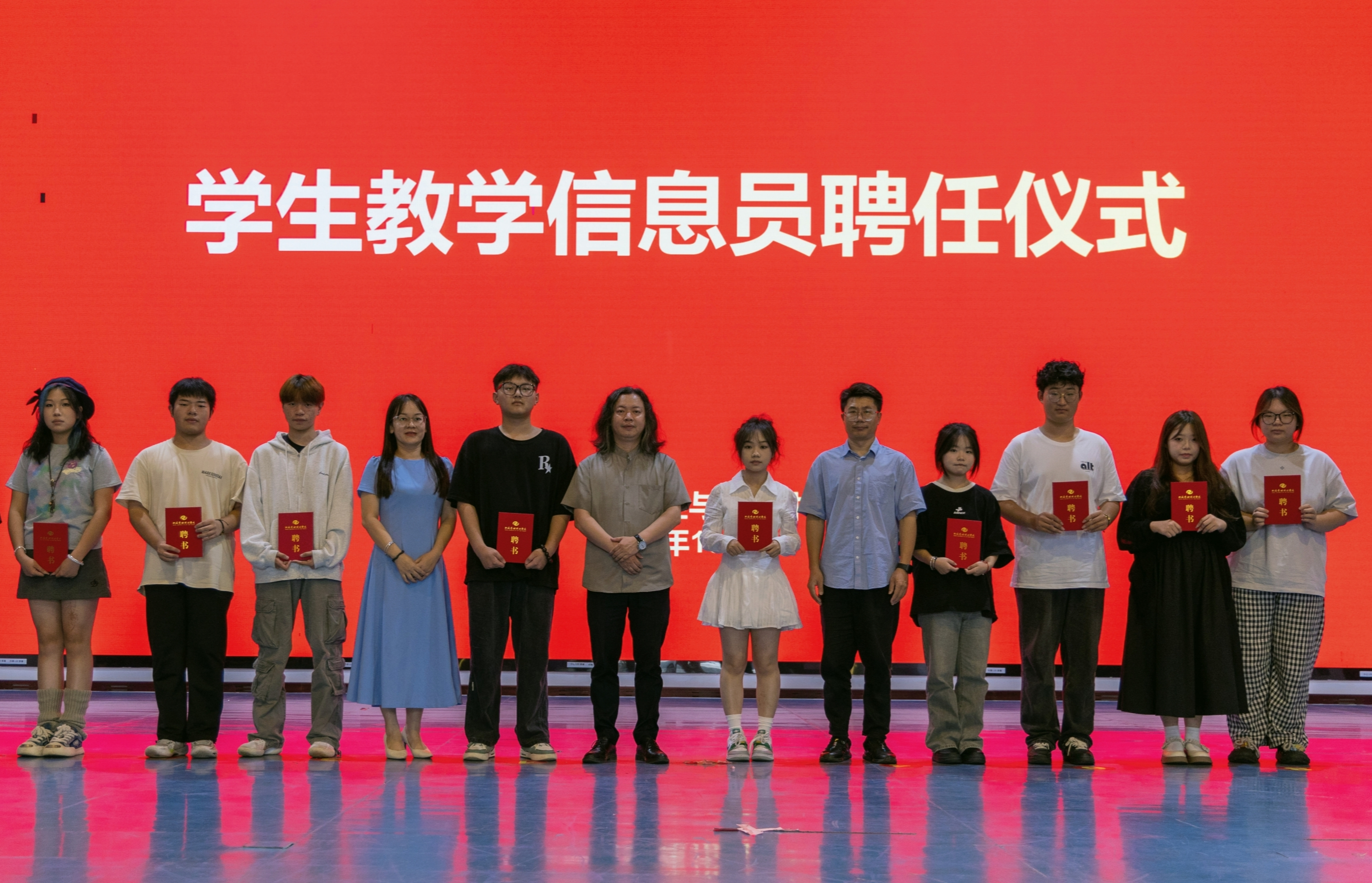会议迎来了新聘信息员受聘仪式。在热烈的掌声中,校领导为新聘信息员们逐一颁发聘书并合影留念。