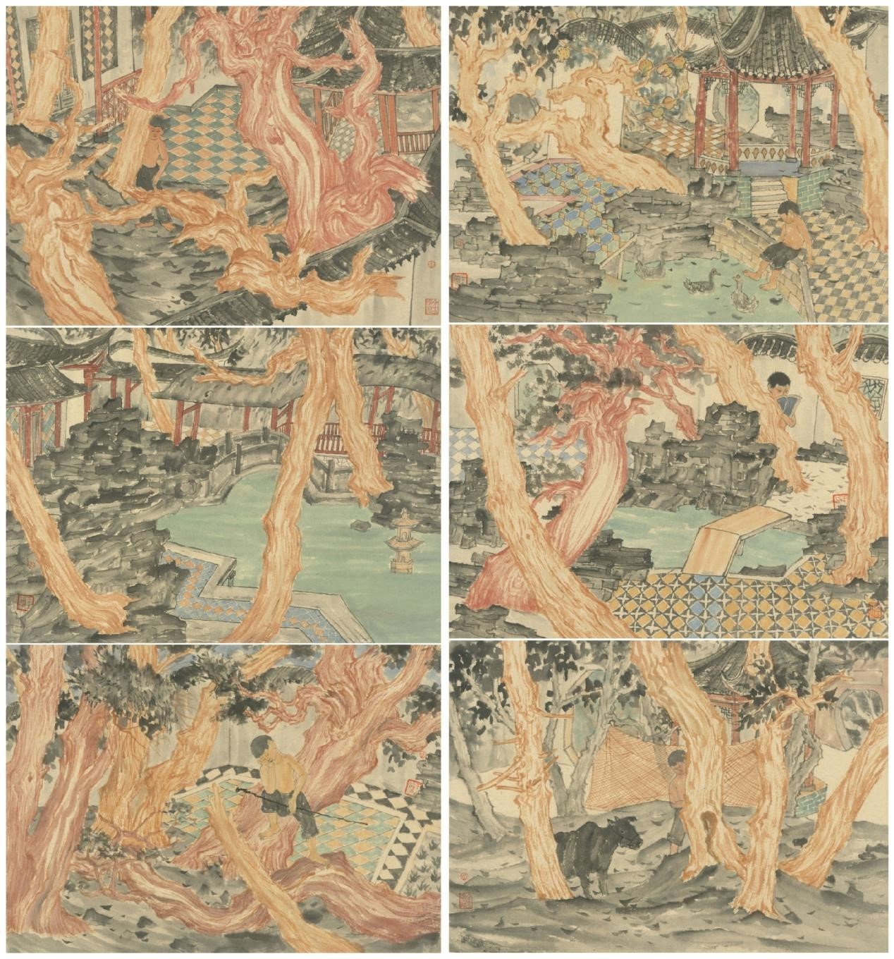 《读乐园》 纸本设色 32.5x45cmx6