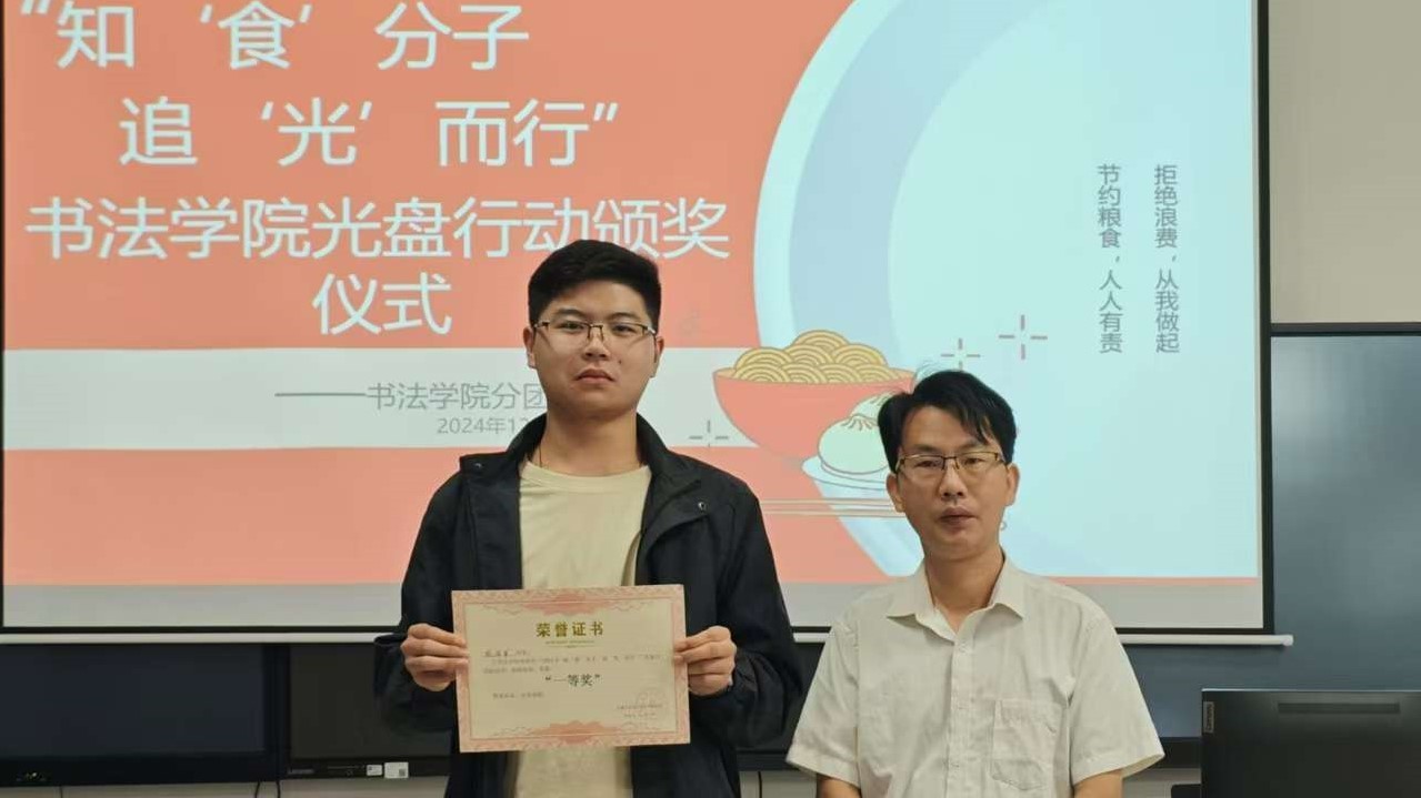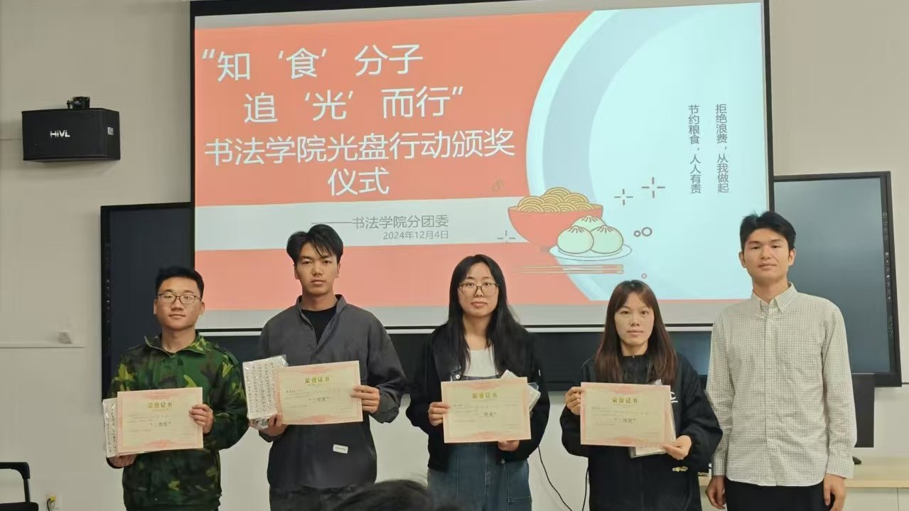 本次“知‘食’分子,追‘光’而行”光盘行动的颁奖仪式于12月4日在南校区艺德楼507书法教研室进行由书法学院常务副院长苏乃从、党支部书记喻广林、学工办主任兼分团委书记李家琪、实验室主任宁梦宇等领导教师为获奖同学颁奖。