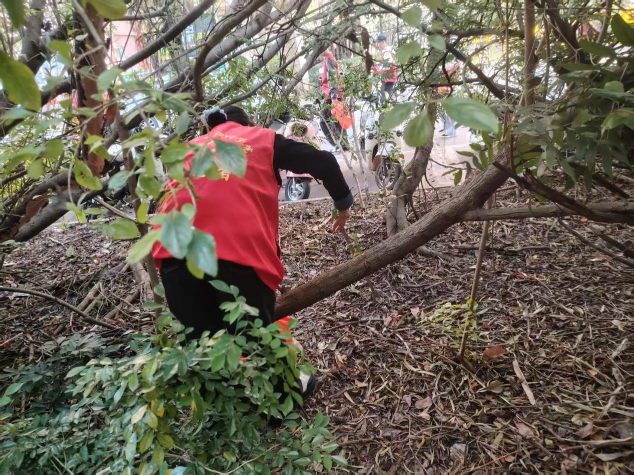 (志愿者对责任区卫生死角进行清扫)
