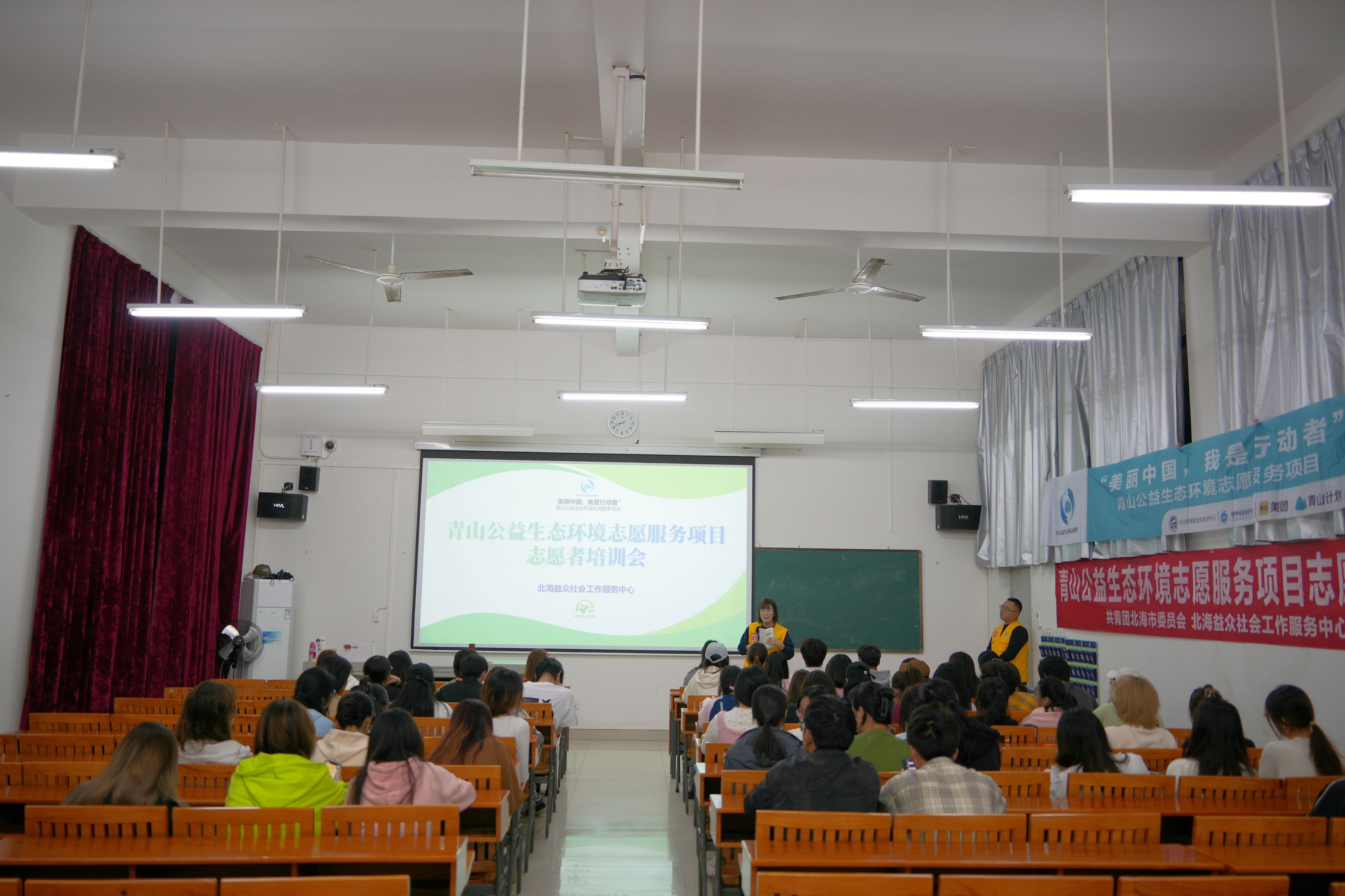 为全面贯彻落实党的二十大精神,深入学习领会习近平生态文明思想,践行“绿水青山就是金山银山”的理念。3月21日,北海益众服务中心在我校开展了“青山公益生态环境志愿服务项目”志愿者培训会。