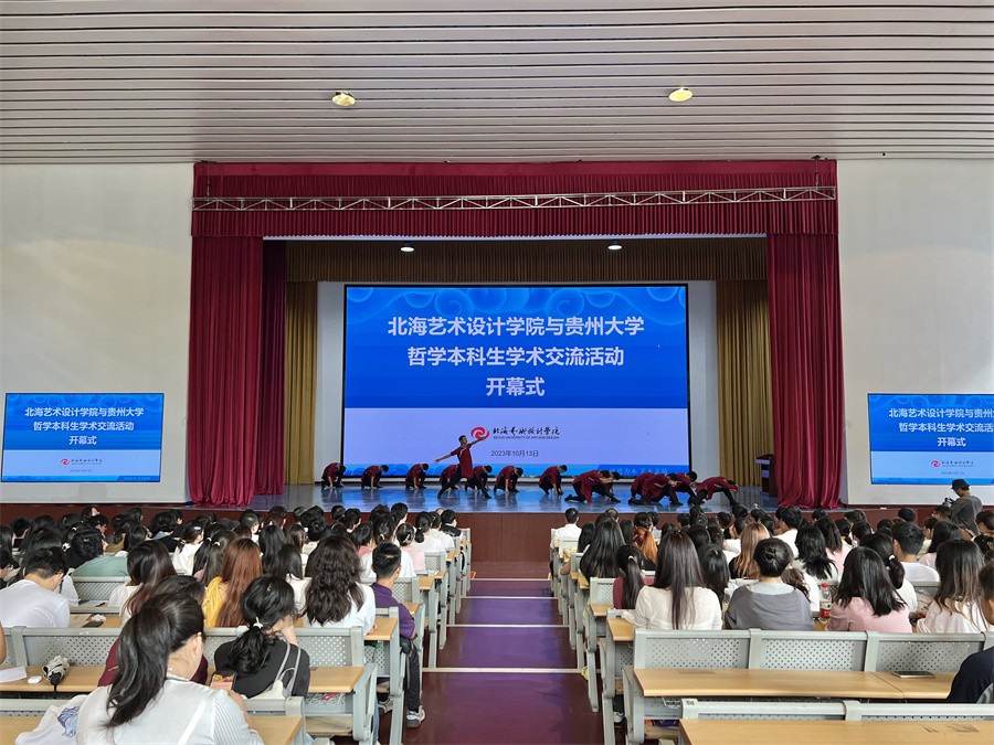 近日,北海艺术设计学院与贵州大学哲学本科生学术交流活动开幕式在我校西校区大礼堂顺利举行。此次开幕式由北海艺术设计学院主办, 贵州大学哲学学院党委书记周乐成、哲学学院宋君修博士、哲学学院梅其君副院长以及学生代表受邀出席。我校总督学王斌,人文教育学院名誉院长、哲学专业带头人蒙绍荣教授,人文教育学院院长熊秀峰参加此次活动,开幕式由李水亮副院长主持。