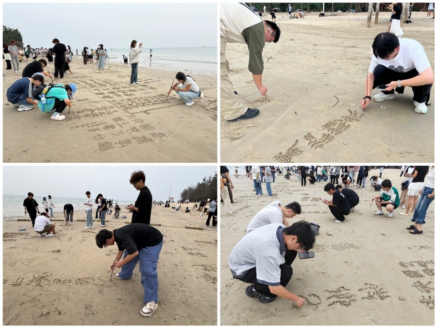 实践活动期间,书法学院还组织学生围绕南湾码头、鳄鱼山景区等人文与自然景观融合地标,开展实地调研与拍摄,以拓宽艺术视野、积累地域特色创作素材,为后续专业创作注入鲜活灵感。此外,部分学生积极参与了“海岛清洁卫士”志愿服务,在公益劳动中践行生态文明理念,强化社会责任意识。
