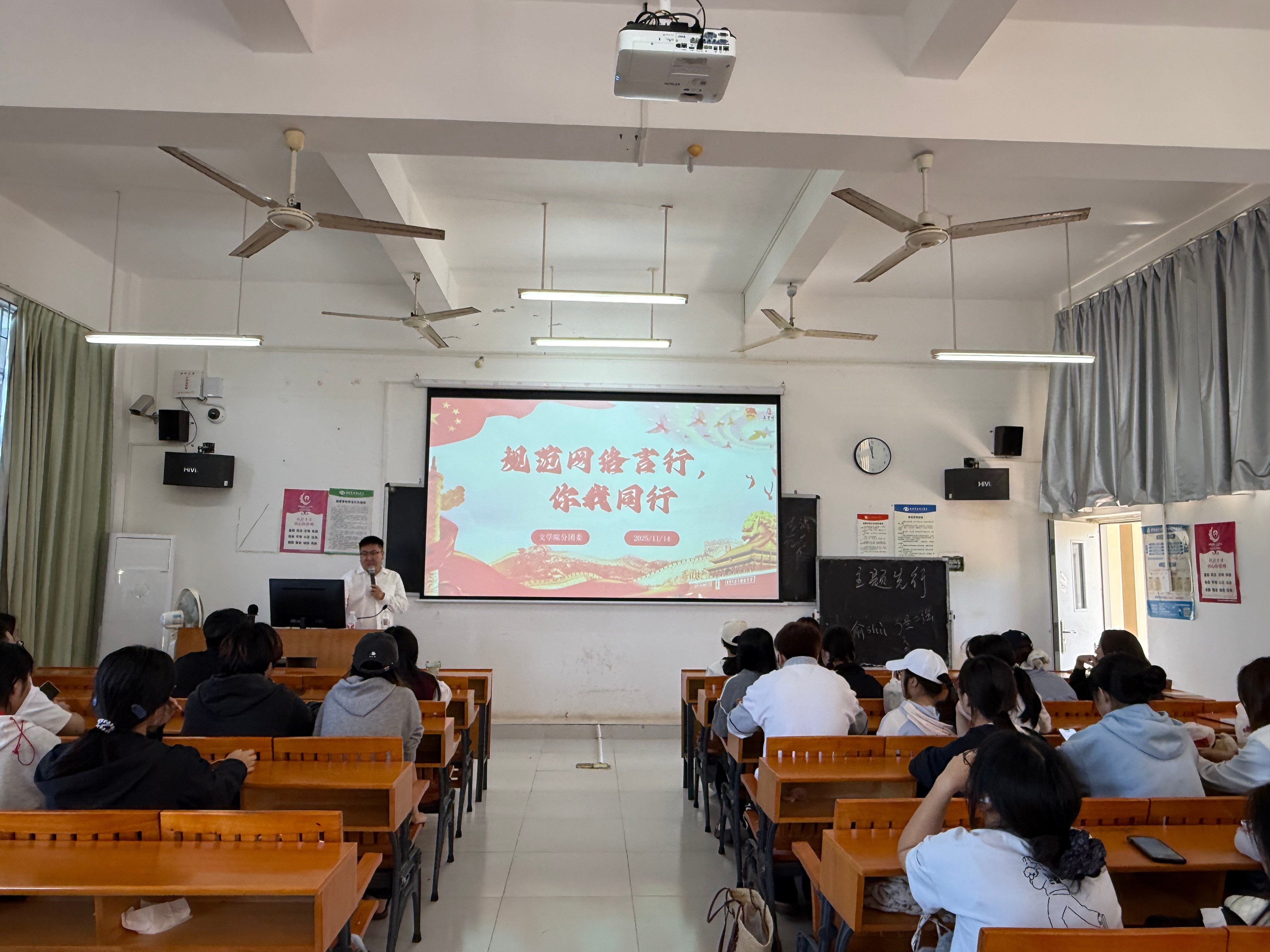 活动伊始,文学院分团委书记马有泽结合数据与案例解读互联网发展现状,强调团员青年需担起网络秩序维护责任。现场通过案例剖析、隐私保护、行为倡议等环节,引导同学们辨明信息、尊重隐私、抵制不良内容。