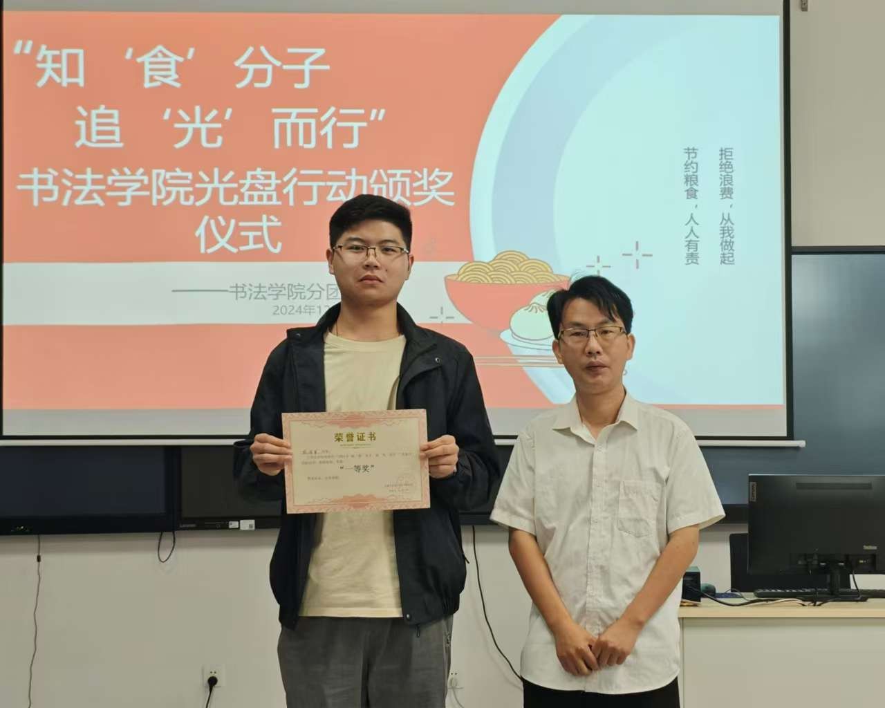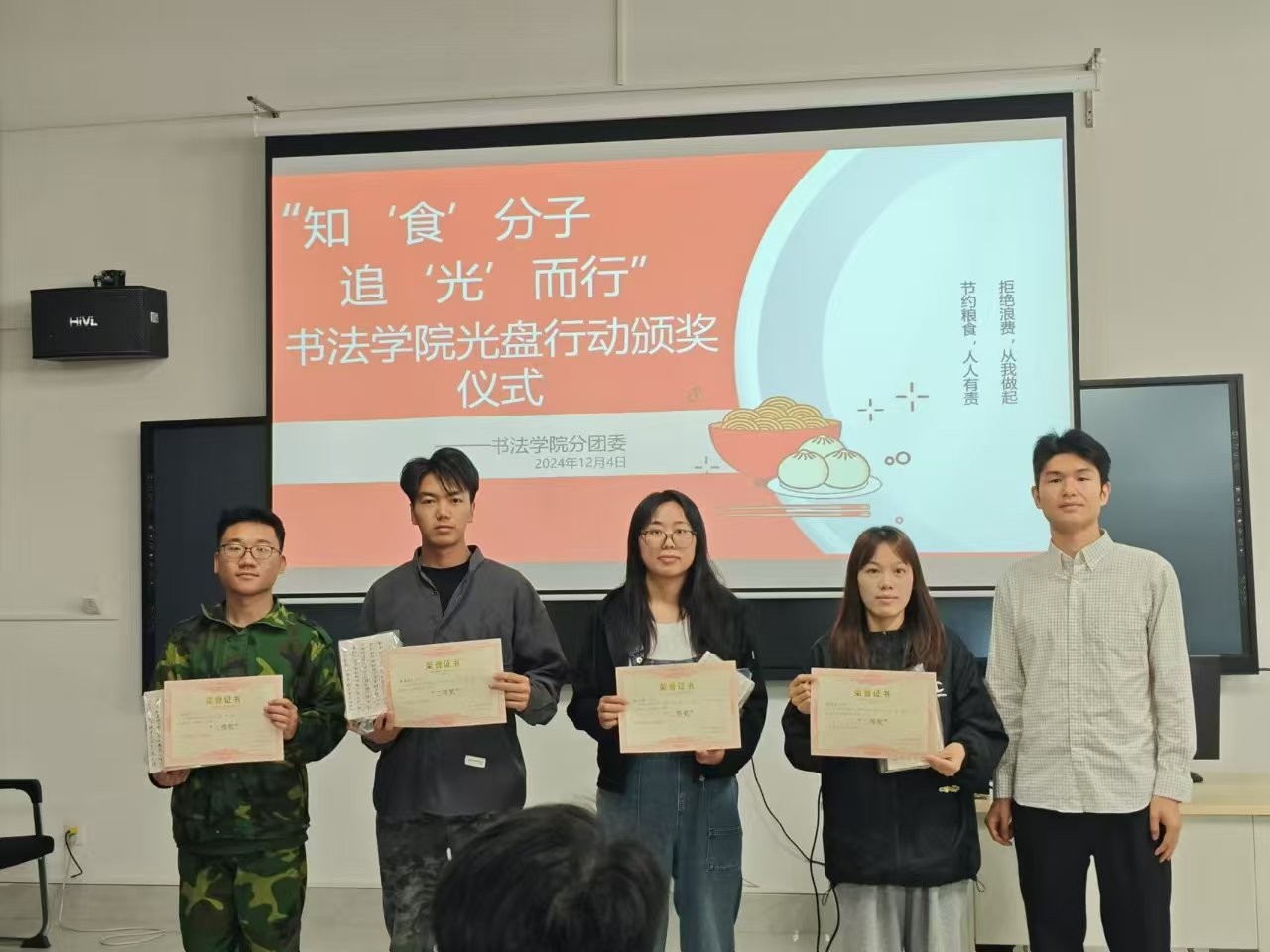 12月4日在南校区艺德楼507书法教研室进行“知‘食’分子,追‘光’而行”光盘行动的颁奖仪式,由书法学院院长苏乃从、党支部书记喻广林、学工办主任兼分团委书记李家琪、实验室主任宁梦宇等各位领导老师为获奖同学进行颁奖。